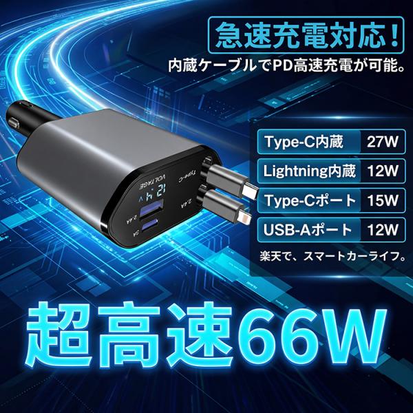 車用充電器 シガーソケット 延長 充電器 巻き取り リール式 USB Type-C Lightning PD急速充電 iPhone Android 車用充電器 4ポート カーチャージャー 4台同時充電