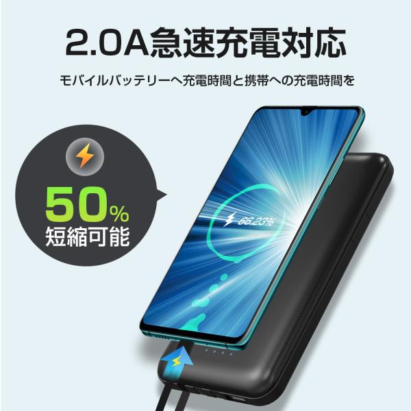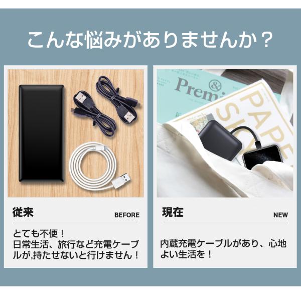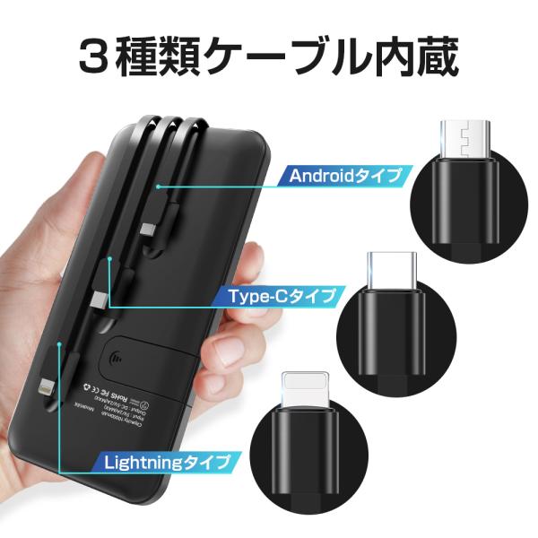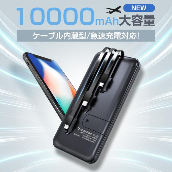 モバイルバッテリー 大容量 10000mAh 急速充電 軽量 薄型 3ケーブル内蔵 PSE認証 持ち運び便利 スマホ 充電器 4台同時充電 携帯バッテリー iPhone Android 対応