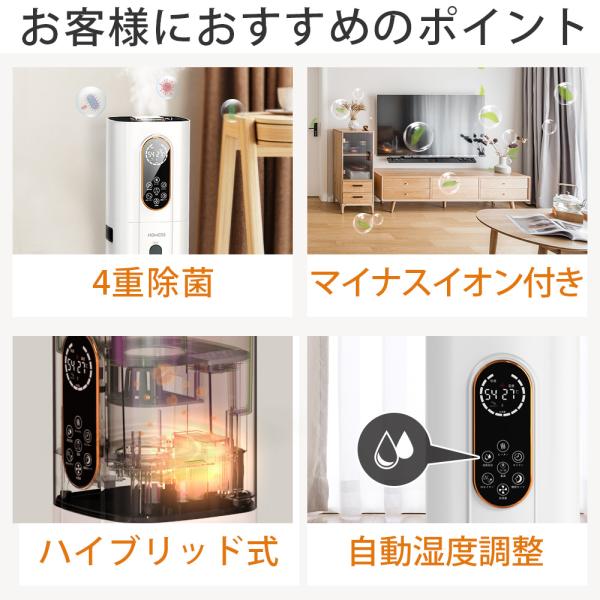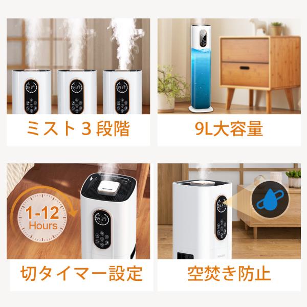 「最新型」加湿器 大容量 タワー型 9L ハイブリッド加湿器 4重除菌 マイナスイオン機能 UV除菌 ヒーター機能 高温除菌 6段階加湿量調節 タイマー付き