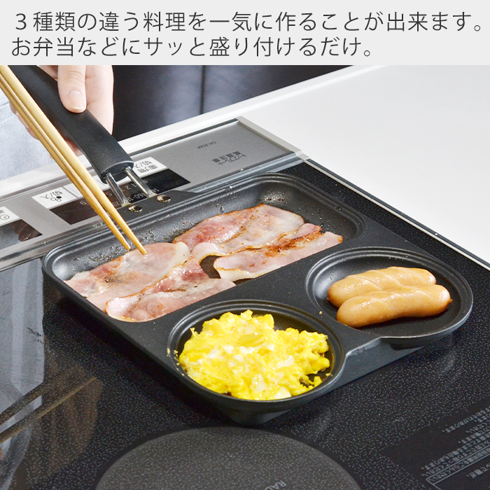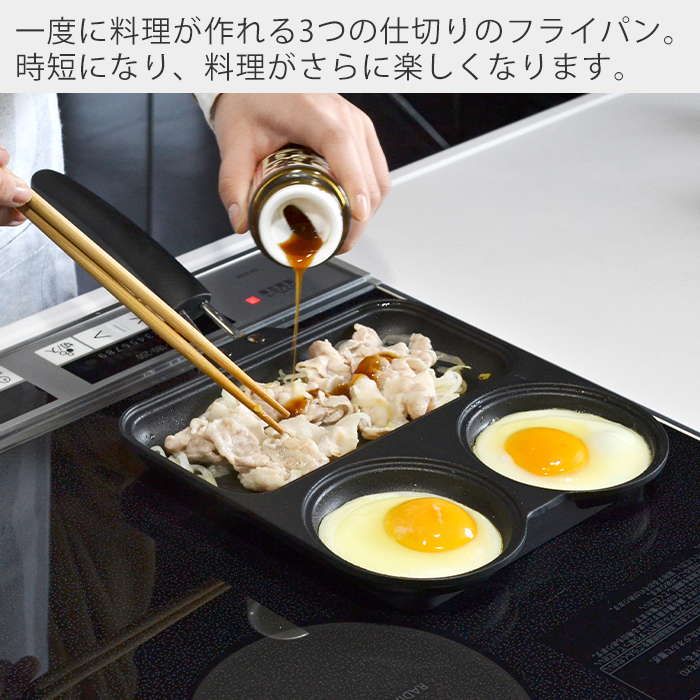 少人数向けの3つの仕切りフライパン。一気に料理を作れるので時短になります。焦げ付きにくいフッ素樹脂塗膜加工で、丸の部分では目玉焼きやパンケーキがキレイに焼けます。料理が苦手な方や、初心者の方にもおすすめ。