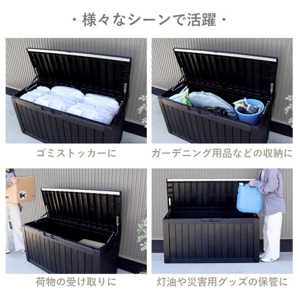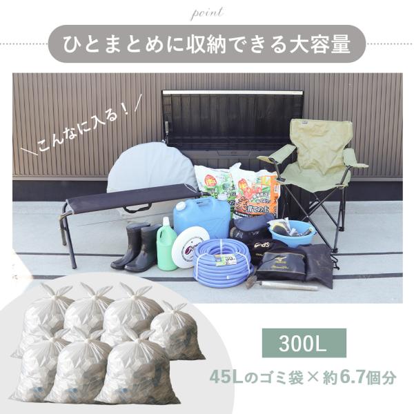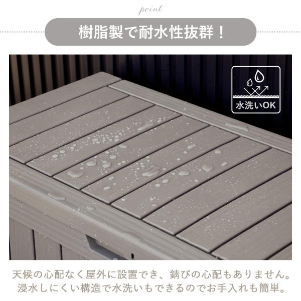屋外でも屋内でも使用可能な大容量ストレージベンチボックス。樹脂製のため、屋外に設置しても錆びの心配がありません。浸水しにくい構造で水洗いもできるので、お手入れも簡単。大容量の300Lサイズは、45Lのゴミ袋が約6.7個分も収納できます。ゴミストッカーとして使用したり、ガーデニング用品やアウトドア用品、お子さまの遊び道具などの収納に使用したり、灯油や災害用グッズの保管に使用したりと様々なシーンで活躍します。南京錠が取り付けられる鍵穴付きで防犯面も安心のため、宅配ボックスとしてもご使用いただけます。高耐久設計のため、椅子としても活躍。さらに、持ち運びやすい軽量であることも樹脂製のポイント。持ち手も付いており、簡単に移動できます。蓋にはガスシリンダーが付いており、軽い力で開閉が可能。簡単組み立て&分かりやすい電子説明書付き。表面の凹凸感までこだわった繊細な木目柄のお洒落なデザインです。