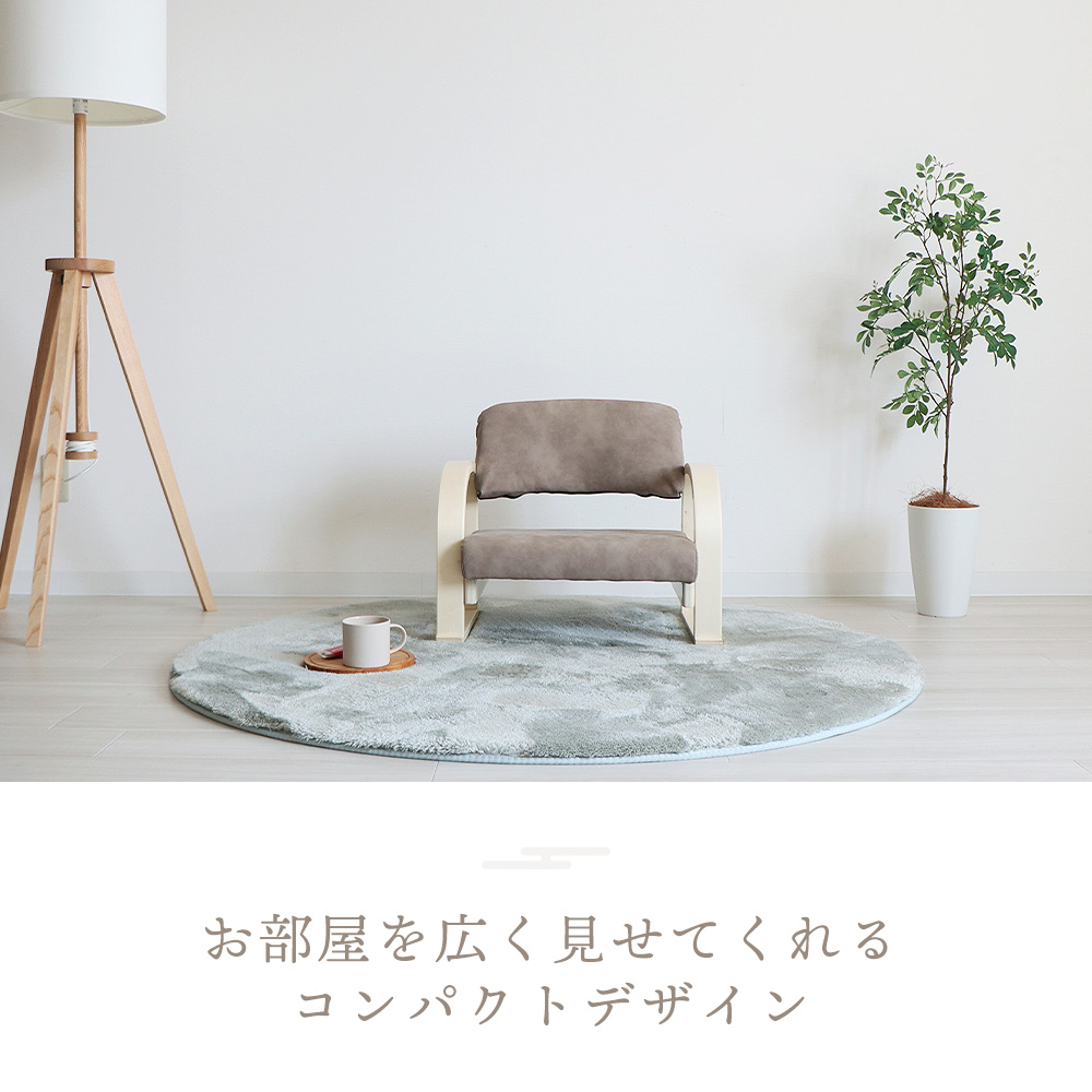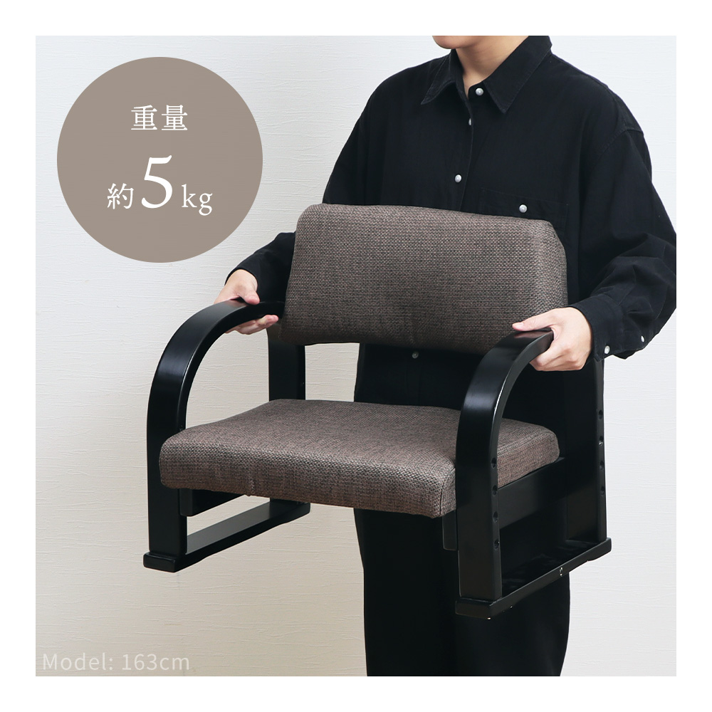 お部屋を広く見せてくれるコンパクトデザインと、落ち着きのある色合い。座面の高さは、身長やお好みに合わせて3段階で調節可能。肘掛け付きで立ち座りもラクにでき、毎日の動作をサポートします。脚部は安定感のあるソリ脚タイプで、キズ防止用のフェルト付き。組立は付属の六角レンチでボルトを締めるだけの簡単仕様です。