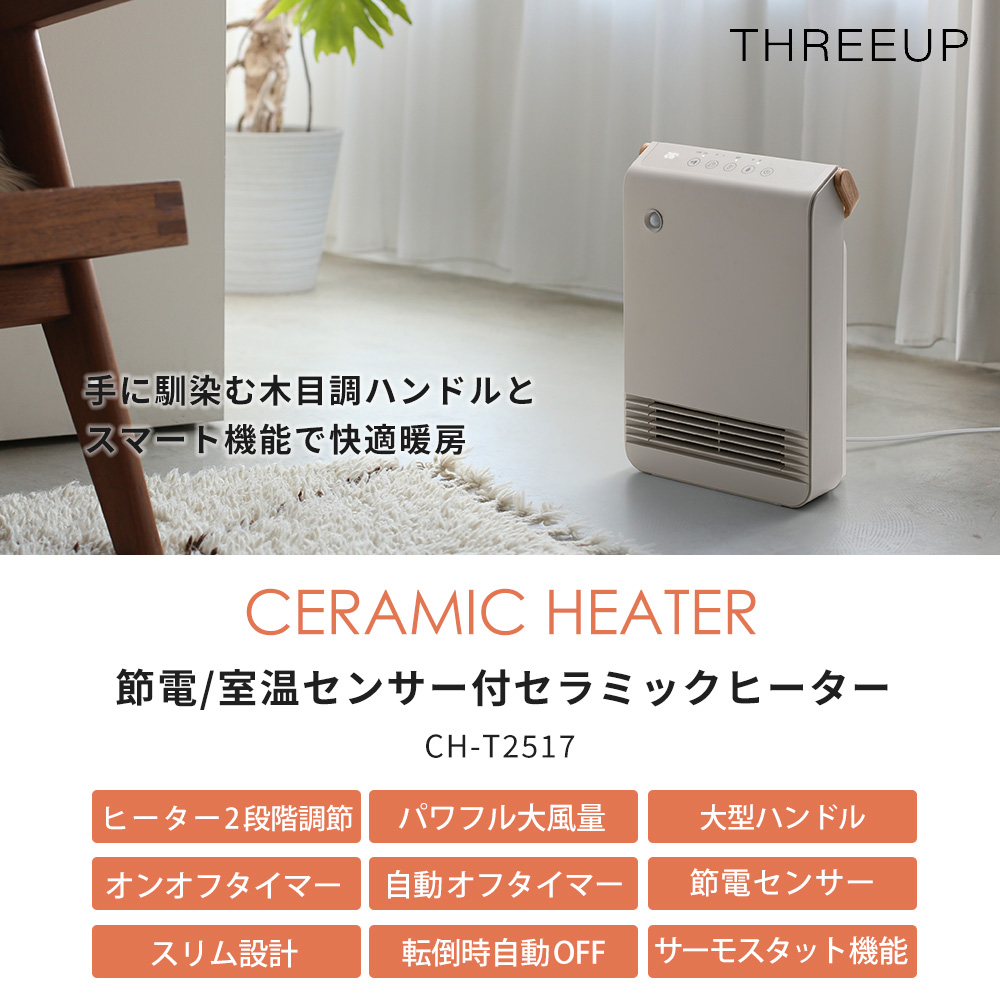 セラミック ヒーター 節電 室温 人感 センサー付 電気 おしゃれ スリム 暖房 大風量 木目 かわいい 軽量 北欧 CH-T2517 THREEUP WOOD STYLE