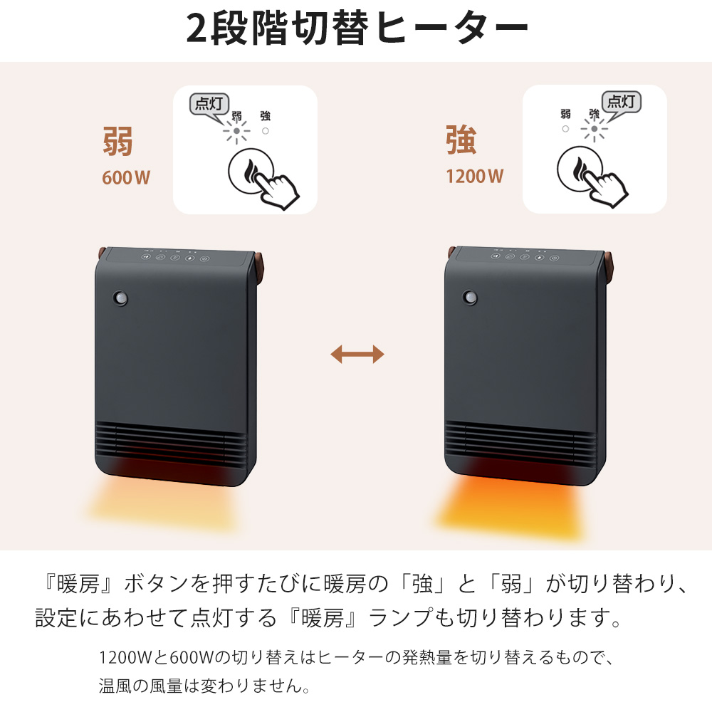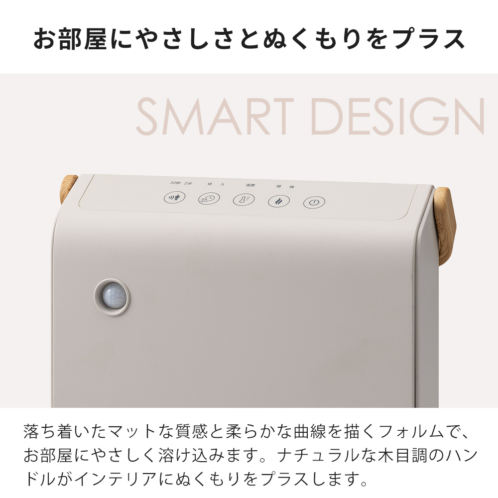 質感の高い木目調とモダンなボディカラーが魅力の「WOOD STYLE」シリーズから、スリム設計のセラミックヒーターが登場。節電センサーと室温センサーを搭載し、快適さと省エネを両立します。1200W/600Wの2段階出力と上下手動ルーバーで、風向きの調整が可能。さらに人の動きを感知して自動で運転を切り替える節電センサーが、無駄な電力をカット。温度は18〜30℃、タイマーは1〜8時間の範囲で設定でき、LEDディスプレイとタッチ操作で直感的に操作が可能。木目調の大型ハンドルは持ち運びしやすく、インテリアにも馴染むアクセントに。機能美と心地よさを備えた、シンプルで洗練された一台です。