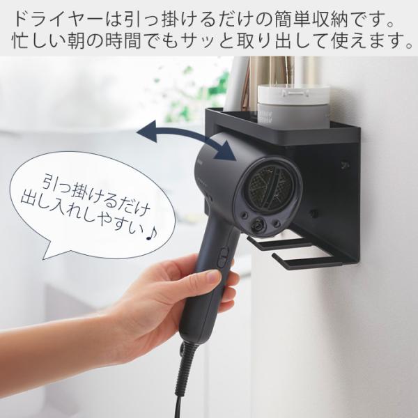 石こうボードピンで壁に簡単取り付けできるトレー付きのドライヤーホルダーです。ドライヤーは引っ掛けるだけの簡単収納で様々な形状に対応しており、ヘアーアイロンやブラシドライヤーなどもまとめて収納できます。電源コードもホルダー部に掛ければすっきりと収納。ホルダー部にはシリコーン製カバーが付いているのでドライヤーにキズがつきにくい仕様です。上部は小物置きとして使えるトレーになっており小物を引っ掛けておくのに便利な可動式フックも付属しています。