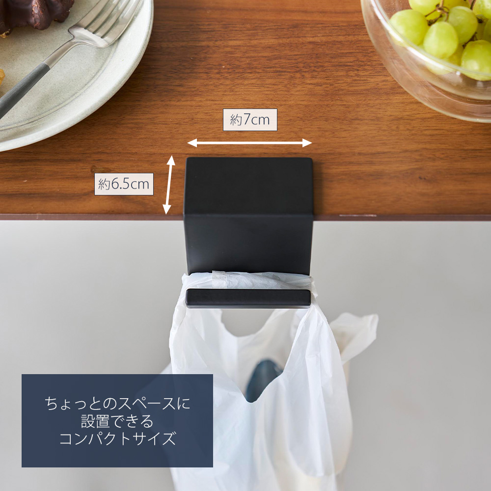 テーブル横に調節ネジで簡単取り付け!コンビニなどで買った物の一時置きやちょっとしたゴミを捨てるのに便利です。コンパクトな浮かせる収納で、置き場所を考えなくて良いので、省スペースに設置できます。フックがワイドなので、レジ袋を掛けると自然に開き、中身を取り出したり、ゴミを捨てるのがスムーズに。調節ネジと付属の六角レンチのみで簡単に取付けできます。レジ袋以外に、バッグの一時掛けにも便利です。耐荷重約1kgでしっかりと支えます。錆びにくい粉体塗装を施したスチールを使用しているので、長くご使用いただくことができます。