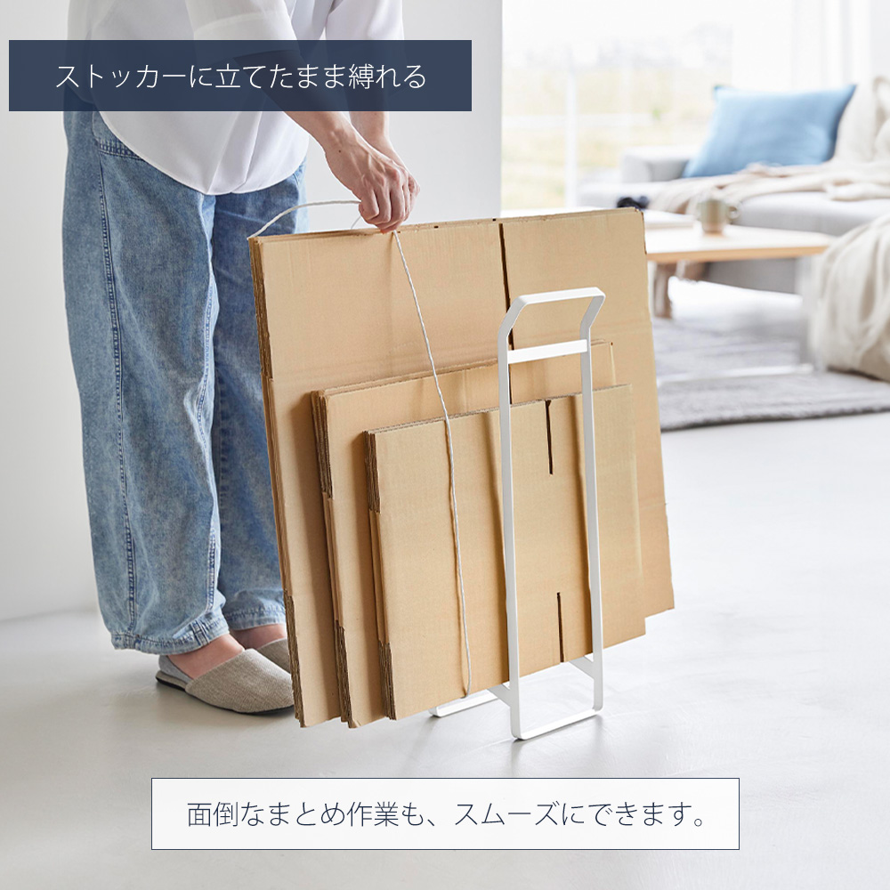 散らばりがちなダンボールをすっきりまとめて収納でき、そのまま持ち運びもできる便利なストッカーです。ダンボールを立てたままひもで縛れるため、まとめ作業もスムーズに行えます。取っ手付きで持ち運びやすく、処分や移動の際にも便利。オープンタイプなので上からでも横からでもサッと収納でき、サイズの異なるダンボールもまとめて整理できます。スリムな設計で省スペースに置けるほか、フック付きでカッターなどの小物も収納可能。日々増えがちなダンボールをすっきり整理できる便利な収納アイテムです。