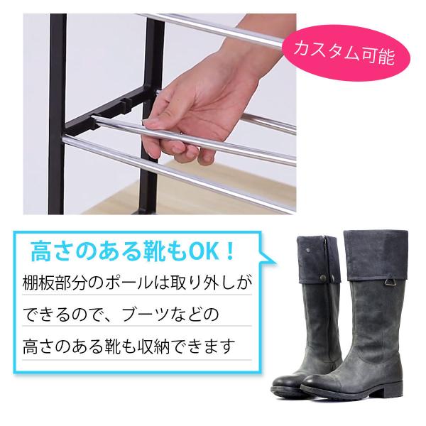 1段ごとにポールが4本ついており、大人用の靴から子供靴まで、サイズを問わず収納することができます。