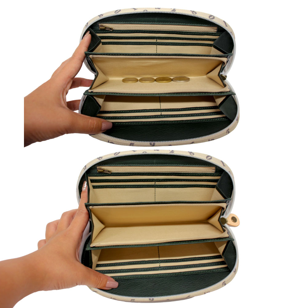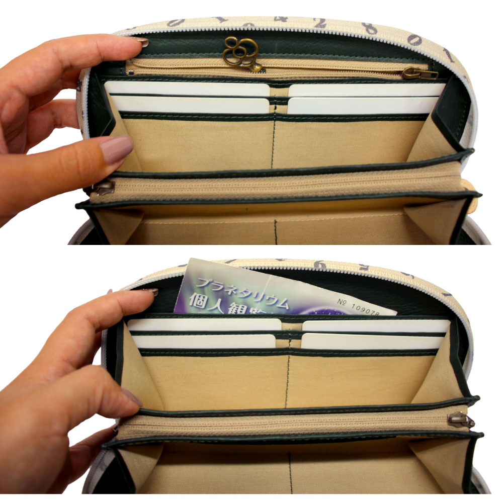 背面部スリットポケット×1 ラウンドファスナー開閉:カードポケット×9 スリットポケット×2 お札入れ×2 L字ファスナー小銭入れ(仕切り無)×1 ファスナーポケット×1