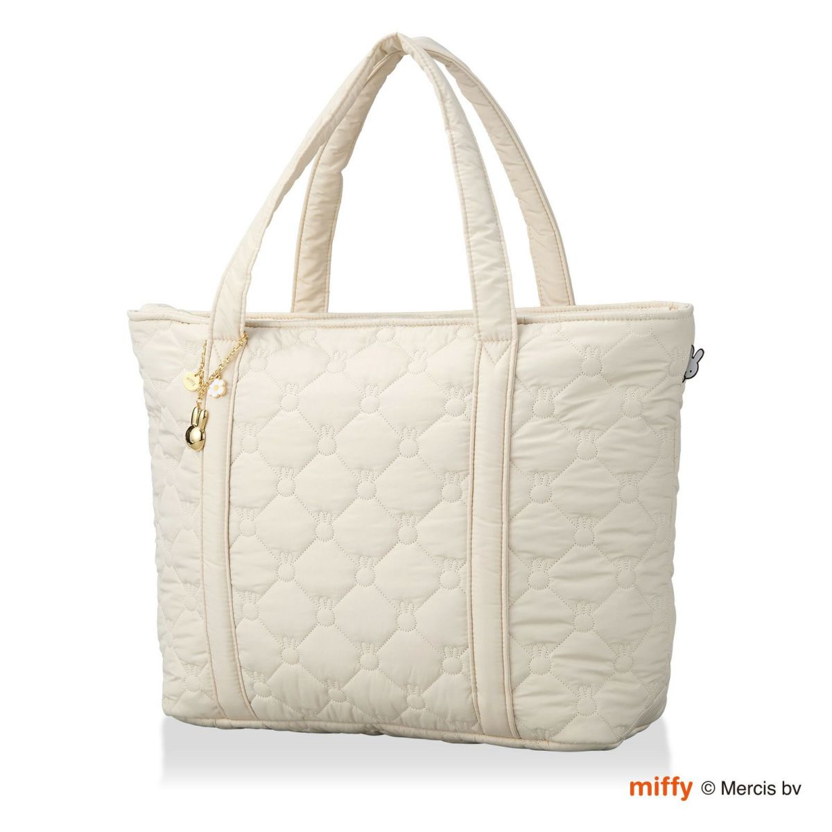 容量約22Lと収納力抜群なトートバッグです。マチも広く、A4も入るサイズ。ミッフィーのお顔の形をした可愛いチャームがついています。
