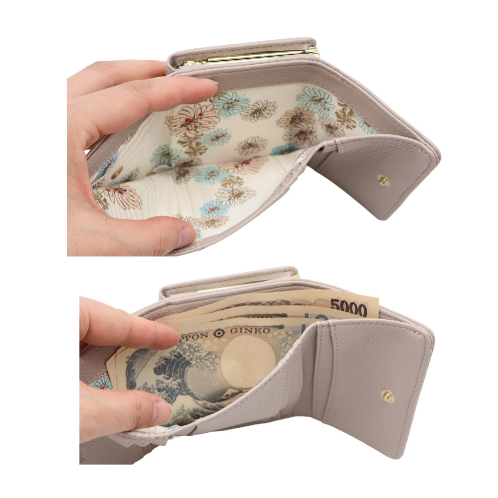 リミニバッグにも収納可能なサイズで、普段使いに最適。デザインのワンポイントとなる口金式の小銭入れは、開け閉めがスムーズで、お会計時ももたつきません。