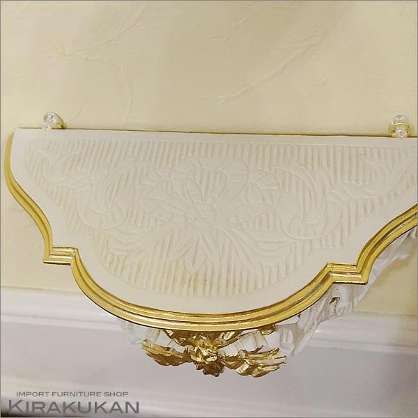 【コメント】イタリア製のホワイトをベースにロマンチックスタイルの壁掛けコンソールです。 ポイントは、中央に施されたゴールドのリボンがアクセントになっていて、2ヶ所の掛け金具によりお好きな壁面に飾ることができます。可愛いプランターを置いたり、小物を飾ったり、使いからはアイデアしだいですね。