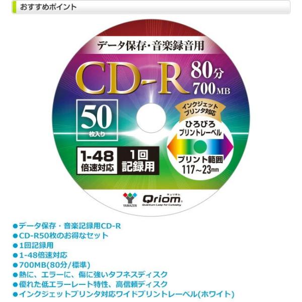 データ保存/音楽用 1回記録用 CD-R 1-48倍速 50枚 700MB キュリオム QCDR-M50SP CDR 再生 保存 メディア データ記録用 音楽録音用 スピンドル 山善