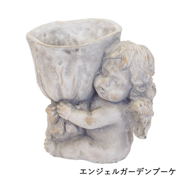 ●可愛い天使をモチーフにしたセメントポットです。天使が両手で大きなブーケを抱えたデザインで、そのブーケ部分がポットになっています。花を植えると、まるで天使が実際に花束を抱えているかのような演出が楽しめます。