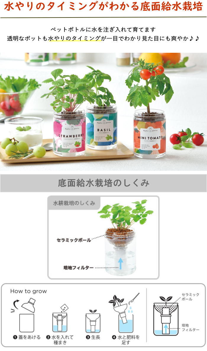●ペットボトル型の給水システムで、土を使わずに育てる水耕栽培をおうちで手軽に楽しめる人気商品。