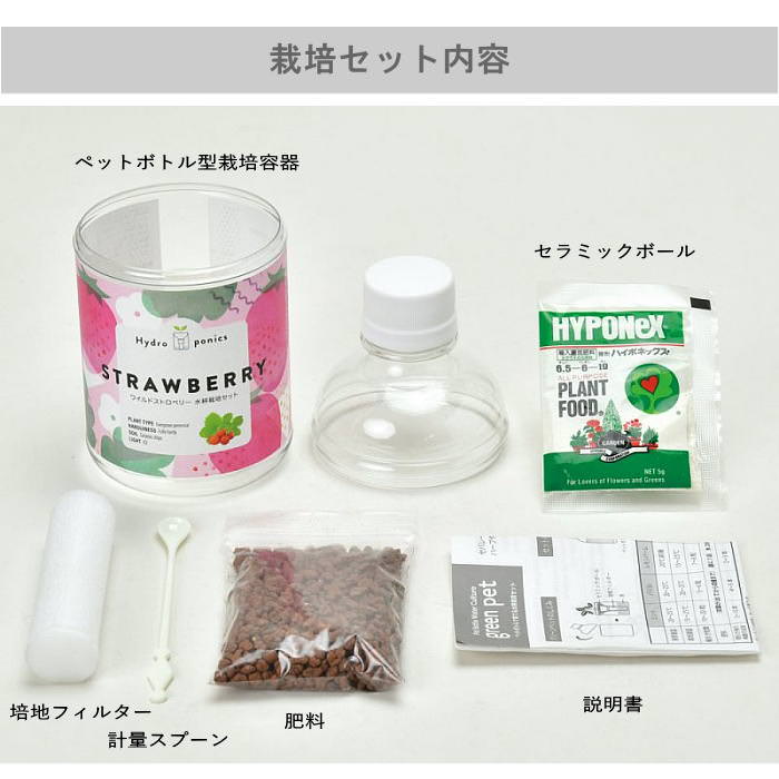 ペットボトル型栽培容器/培地フィルター/種/セラミックチップ/肥料/計量スプーン/説明書(日本語/英語)