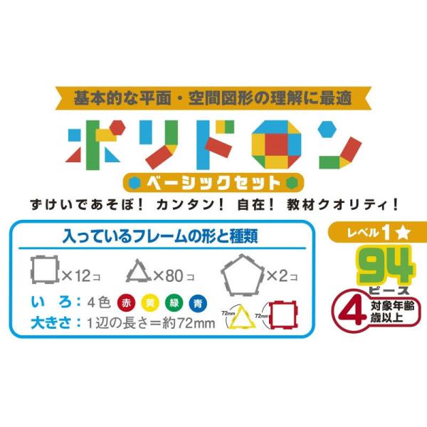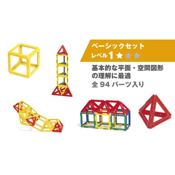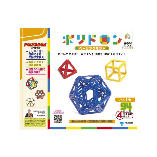 かんたん!自在!教材に! 辺と辺をはめ合わせながら、三角形をしきつめたり、正方形で立体をつくったり、さまざまなかたちを自由につくっていくうちに、より早く深く理解できる図形学習教具・ポリドロン。 このセットは、基本的な平面・空間図形の理解に最適なアイデアブックと基本の94ピースが入ったセットです。【ポリドロン5つの特徴】 1.簡単 組み立ては辺と辺をカチッとはめ合わせていくだけ。軽量なので複雑なモデルを組むにもぴったり。 2.自在 タテ・ヨコ・ナナメと簡単につなぐことができ、思いもよらない形と出会えます。 3.楽しい イマジネーションが刺激され、工夫次第で無限の組み合わせ。夢中になります。 4.片付けやすい 作った後の片付けも楽々。折りたたむようにすれば、フレームは簡単に外せます。 5.思考力・図形センスが伸びる 遊んでいるうちに、立体的な図形を組み合わせる感覚や空間を把握する能力が自然と身につきます。 【商品仕様】 アイデアブック(24ページ) 基本の94ピース ISBN:978-4-487-77331-2 【販売元】 東京書籍