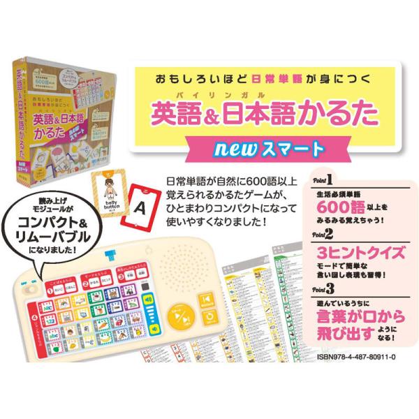 自由なアイデアをあそびながらカタチに! 英語と日本語の両方で身の回りのものの名前を覚えるための読み上げモジュール付かるたゲームが、ひとまわりコンパクトになって使いやすくなりました! 読み上げモジュールもコンパクト&リムーバブルになりました。イラストや文字に集中しながら、繰り返し音声を聴くことで、あっという間にイメージと言葉をまるごと結びつけて覚え、暗唱することもできるようになります。特徴1) 生活必須単語600語以上をみるみる覚えちゃう! 特徴2) 3ヒントクイズモードで簡単な言い回し表現も習得! ヒントを聴いてカードをとるゲームを繰り返し楽しんでいるうちに、ヒントの中で使われている定番のフレーズや叙述表現なども習得していけます。 特徴3) 遊んでいるうちに言葉が口から飛び出すようになる! イラストや文字に集中しながら、繰り返し音声を聴くことで、あっという間にイメージと言葉をまるごと結びつけて覚え、暗唱することもできるようになります。【ISBN】 978-4-487-80911-0【販売元】 東京書籍