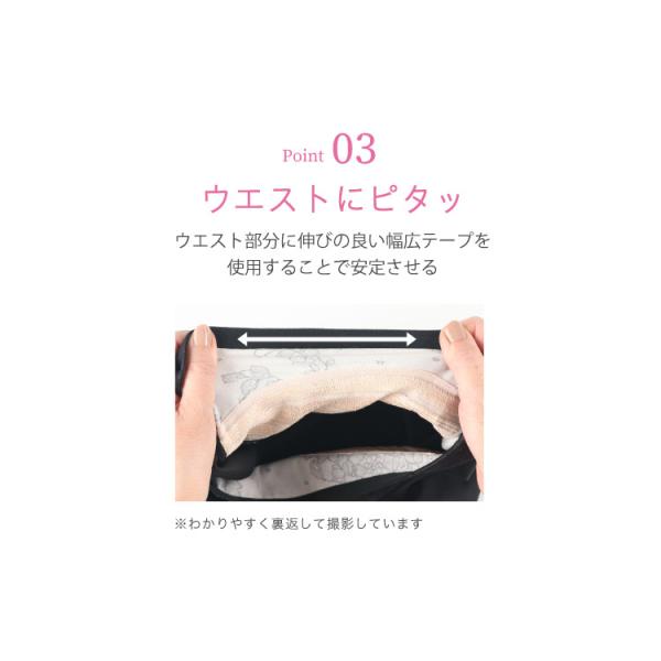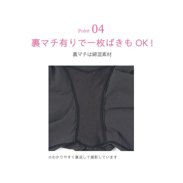 フリーなカッティングの素材でアウターにひびきにくい。裏マチあり(ショーツと同様の裏マチ素材)通常の1枚ばきできるボトムより裏マチの面積を広めた設計。