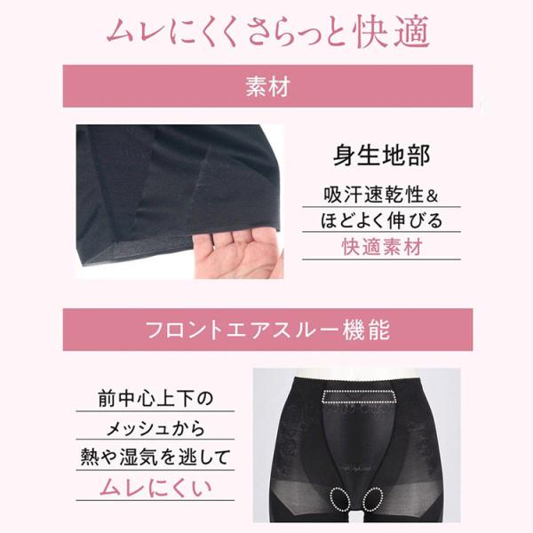 吸汗速乾性があり、ほどよく伸びる素材で動きもらくらく、さらっと快適なはきごこち。キュッとヒップアップ、おなかもほどよくサポートしてすっきり。