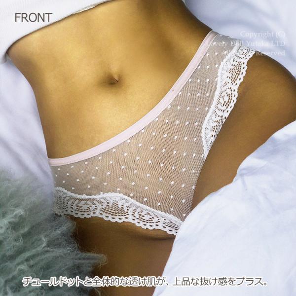 ベースとなるメッシュ生地には小さなドット柄が入っており、トリミングのレース使いや、深めのレッグカットが美脚なシルエットも演出してくれるショーツ。