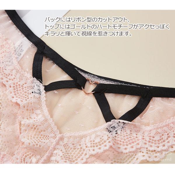 チュールドットとバックのクロスコードが甘辛いムードを醸し出す、Tバックショーツ。