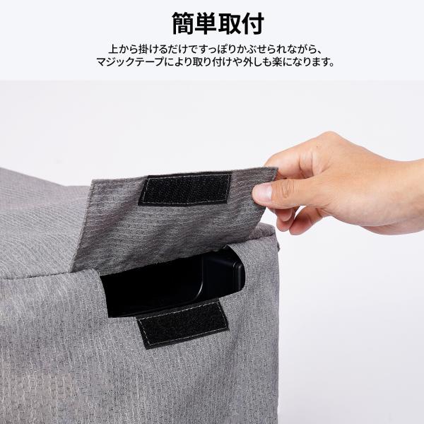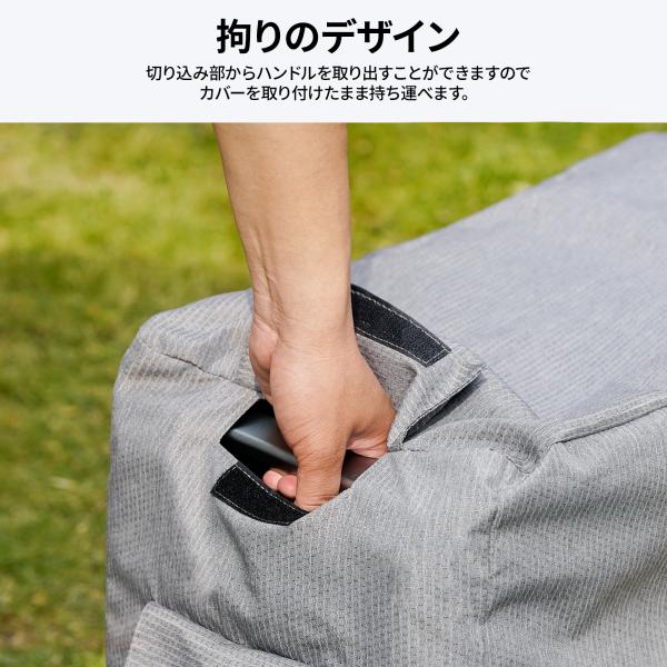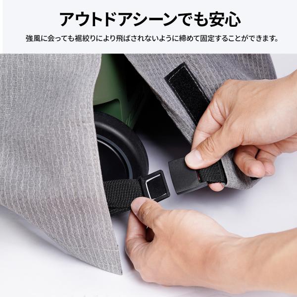 カバーの裾の部分にはバックル付きのベルトが装備され、強風でも飛ばされないように、締めて固定することができます。