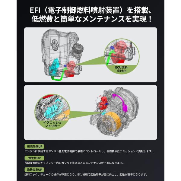 電子制御燃料噴射搭載で燃費向上。ECUによる最適制御でスムーズ始動。キャブレター不要で長期保管後も即稼働。