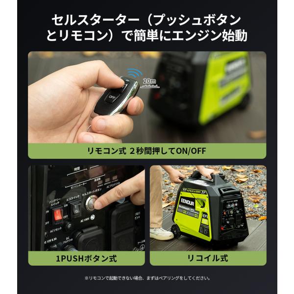 セル・リモコン・リコイル式の3WAY始動で確実に起動。大型キャスター&伸縮ハンドルを搭載し、27kgの機体も楽に移動可能。