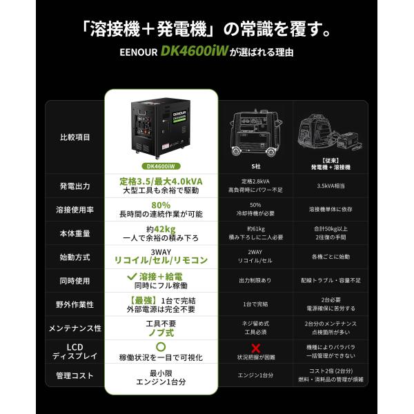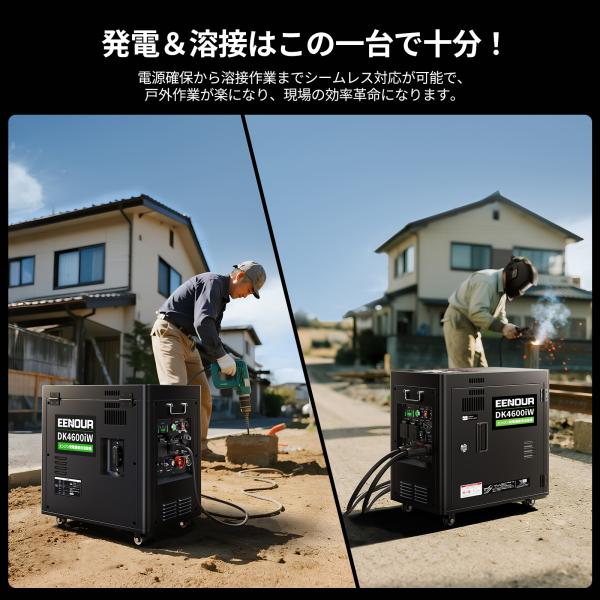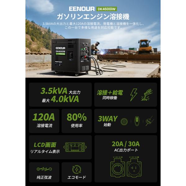 EENOUR ガソリン発電機兼用溶接機 最大4.0kVA AC出力 100V/120A 80%使用率 アーク溶接 静音 液晶表示 軽量 建築現場 エンジン溶接機 工業 爆買 DK4600iW