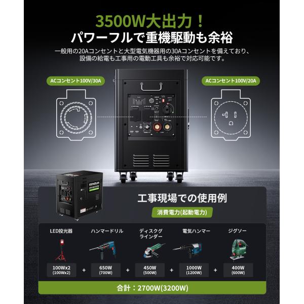 ●3.5kVAの高出力! 30Aコンセント搭載で重機や電動工具も余裕。