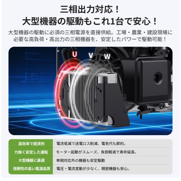 三相200V出力に加え、単相100V/200Vも同時使用可能。