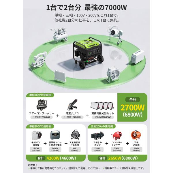 ・業界初!唯一の単相・三相ともに7000W出力のガソリンエンジン大型発電機