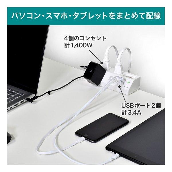 ELPA エルパ ガッチリ電源タップ 集中スイッチ AC 4個口 USB-A×2 2m 雷ガード ホワイト WLS-DS4232SUA W(2569611)