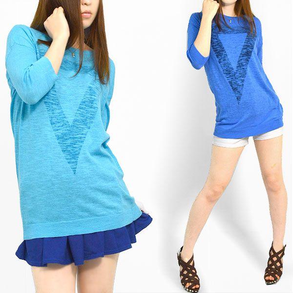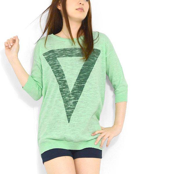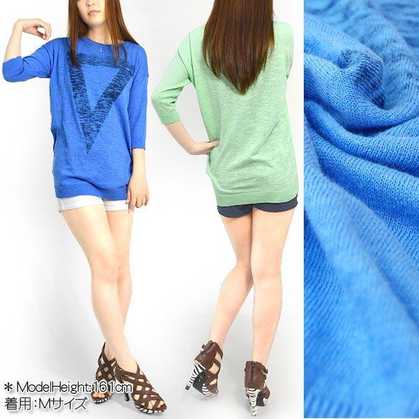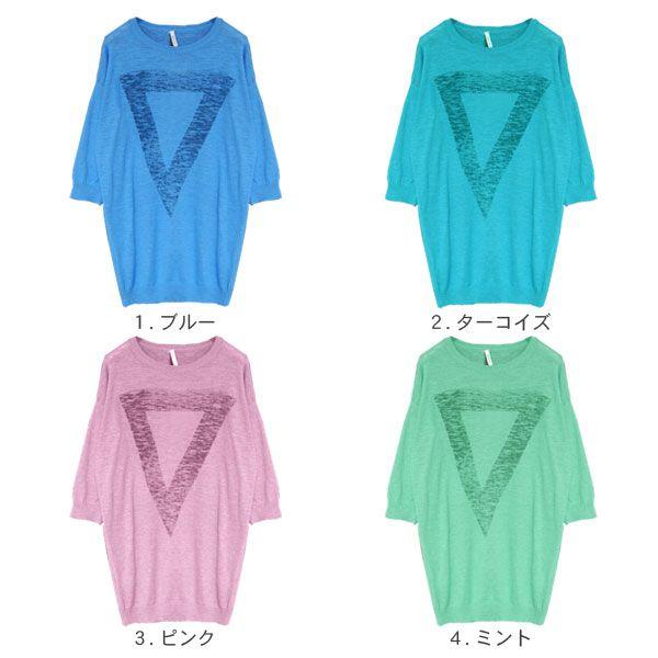サマーニット レディース 七分袖 五分袖 チュニック 薄手 カットソー 夏 長袖 プリントTシャツ Tシャツ 三角 トライアングル 安い おしゃれ ロゴ PRD