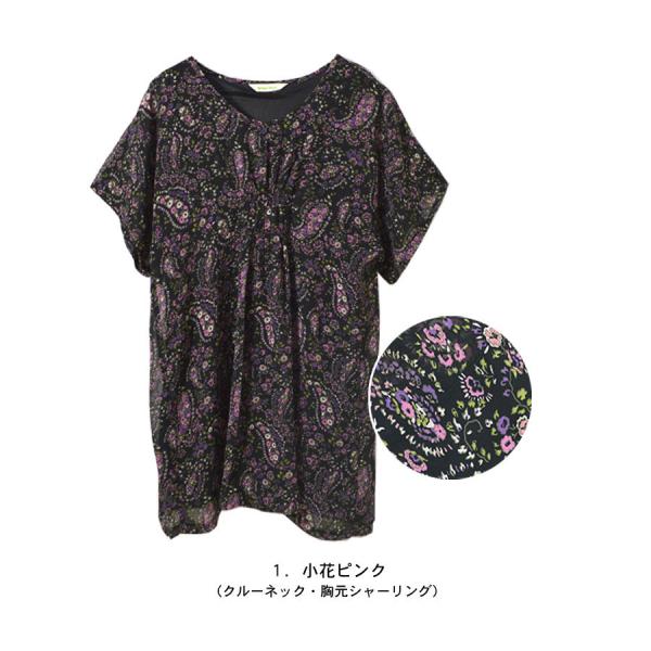 【ワンピース チュニックワンピ レディース 花柄 小花柄 ペイズリー 総柄プリント マタニティ 五分袖 半袖 フレア袖 二の腕隠し 体系カバー 胸元シャーリング ギャザー シフォン ひざ丈 ミニ丈 ミニワンピース フレア Aラインシルエット ゆったり 大きいサイズ レトロ S M L LL サイズ】