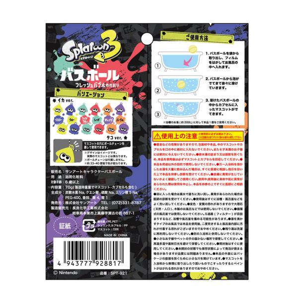 スプラトゥーン3 バスボール 9個SET SPT-921-9スプラ3 イカ タコ フウカ ナワバリバトル 任天堂大人気ゲームの最新作”スプラトゥーン3”のイカ&タコマスコット入りバスボールが登場!温度によって色が変化するイカしたマスコット入り!【 サイズ 】 サイズ / バスボール:直径53 マスコット:W20/H27/D10mm【 素 材 】 素材 : TPR【 原産国 】 中国 サンアート キャラクターランドはなはな