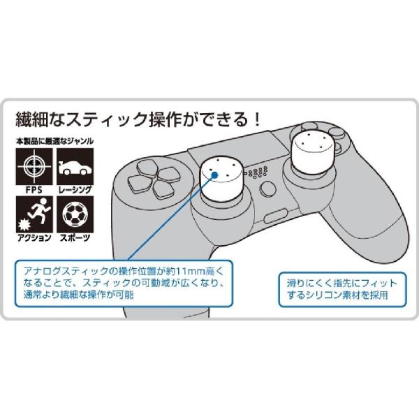 PS4用コントローラーのアナログスティックに装着して、FPS(一人称視点シューティングゲーム)などにおけるエイミング(照準合わせ)の操作性を向上させるHIGHタイプのカバーです。アナログスティックの操作位置が約11mm高くなることで、スティックの可動域が広くなり、細かな操作が可能となります。FPS以外にもレーシングゲーム、アクションゲーム、スポーツゲームなど、繊細な操作が必要なさまざまなゲームで効果を発揮します。