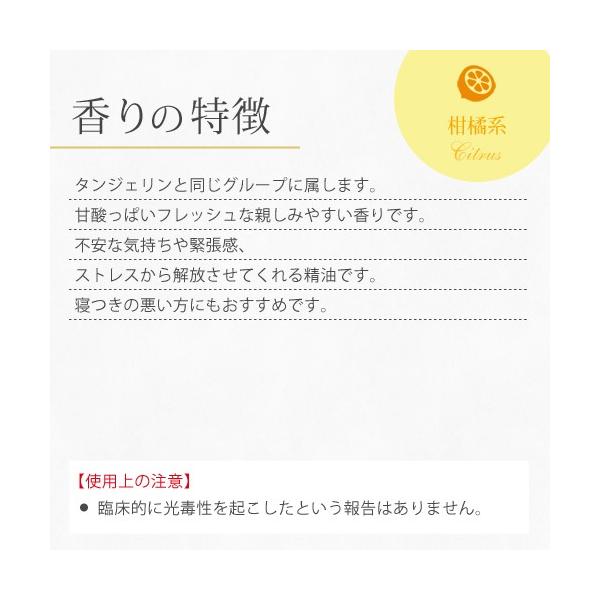 タンジェリンと同じグループに属します。甘酸っぱいフレッシュな親しみやすい香りです。