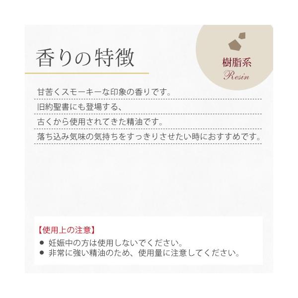 甘苦くスモーキーな印象の香りです。旧約聖書にも登場する、古くから使用されてきた精油です。