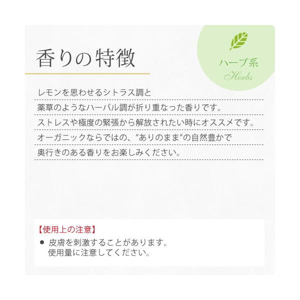 レモンを思わせるシトラス調と薬草のようなハーバル調が折り重なっ た香りです。