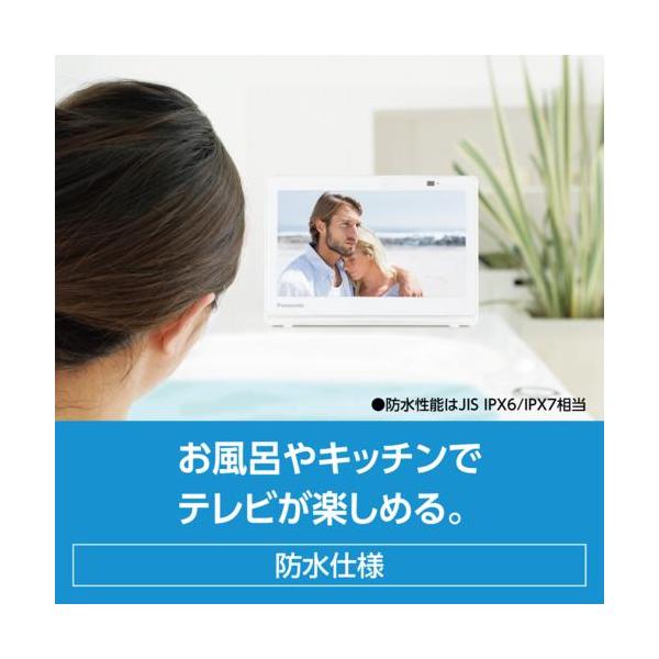 ■お風呂・キッチンで充実したテレビライフが過ごせる+どこでもディーガで外出先からでも視聴可能防水モニター、防水リモコンで、お風呂やキッチンなど水まわりでも安心して使えるバッテリー搭載で、コンセントの場所を気にせず好きな場所に持ち運んで楽しめる■持ち運んで見たい場所にすっきり置ける置きにくい狭い場所でもS字フックを使って引っ掛けて設置可能■テレビ放送はもちろん、ディーガの録画番組も楽しめるUSB-HDD(別売)をつなげば、録画もできる