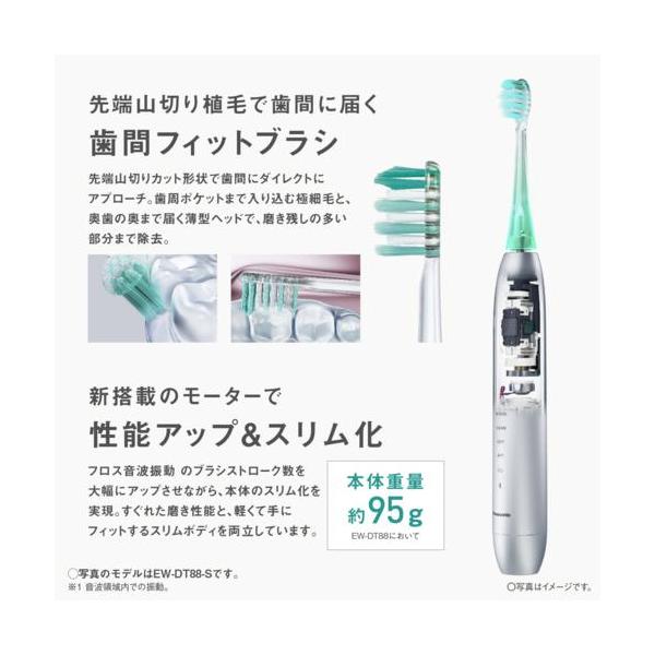 ■W音波振動(※音波領域内での、ヨコ約31000、タタキ約20000ブラシストローク/分の振動※)で、歯間まで驚きの歯垢除去力■「歯間フィットブラシ」×「W音波振動」で歯間の歯垢除去率が200%(※当社基準による歯間部人工プラーク除去率比較。EW-DT88 W-CLEANモードレベル3と、極細毛ブラシコンパクト×W音波振動(W-CLEANモード時)EW-DT63との比較。実際の口内での効果は異なる場合があります。※)にアップ■約3日で歯ぐきの健康を推進(※当社基準による評価※)■押し付け防止センサー(音でお知らせ)