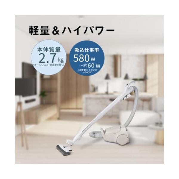 ■軽さとハイパワーを両立させたコンパクトモデル本体質量2.7kgという「軽さ」と、吸込仕事率580Wという「ハイパワーさ」を両立させました■モーター内蔵でスイスイ進むパワーノズルモーターを搭載したパワーノズルで、間口の狭いマンションや家具の多い部屋でもスイスイかけられます■V字構造でゴミを中央に集めてしっかり吸引 独自のV字型の構造で、吸引力の強いブラシの中央にゴミを集め取り残しを防ぎます