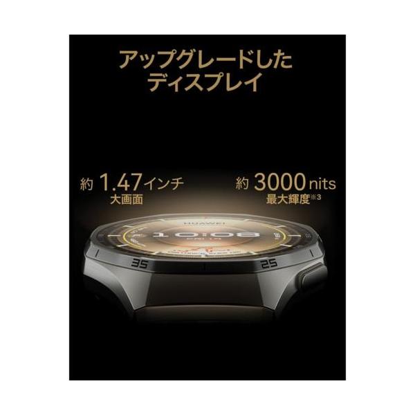■透き通る美しさと高い耐久性を備えたサファイアガラスと、航空宇宙グレードのチタン合金ケースを採用■最高輝度3000nitsの高画質AMOLEDカラーディスプレイにより、強い日差しの下でもハッキリとした視認性を備えています■通常使用で約21日間(ヘビーユースで約12時間)、GPS連続使用は約40時間可能なバッテリー搭載■サイクリングやスキー・スノーボード、トレイルランやゴルフなどオールシーズンの専門的ワークアウトに対応したハイエンドスポーツウォッチ■圧倒的な持久力を誇る、約21日間使えるパワフルバッテリー■100種類以上のワークアウトモード■心電図(ECG)ウォッチの側面にある電極に30秒触れるだけで、詳細な心電図レポートをその場で生成できます。■健康をもっと身近に:新開発のHUAWEI TruSenseシステム