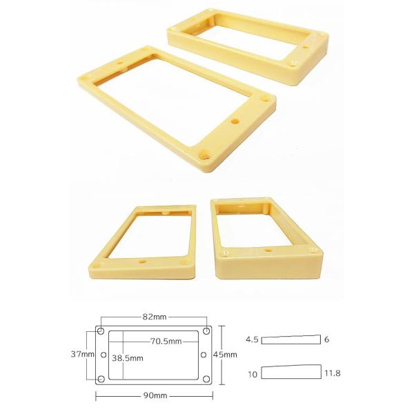 こちらはフロント/リア用エスカッションに止めネジを加えたセットになります。フラット・タイプなので接地面は真っすぐです。一般的なハムバッキングピックアップの寸法に合わせておりますので、ワイドサイズなどの特殊な寸法以外は大抵の場合使用できます。
