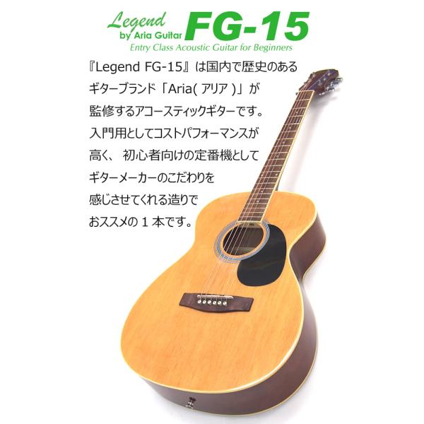 ■国内で長く歴史のあるギターブランド「ARIA(アリア)」が監修するサブブランド『Legend』のエントリーアコギがこの「FG-15」です。一般的なサイズのアコギとしては、取り回しのしやすい小ぶりの「フォークタイプ」のボディで、女性やお子さん(小学高学年、中学生〜くらい)にも比較的抱えやすい安心のサイズ。さらに弦長650mmのフルスケールでしっかりと鳴ってくれる構造。価格帯としては生産工程上での仕上げの粗さ等は多少ありますが、リーズナブルかつバランスがとれた、初心者の方にはおススメの1本です!