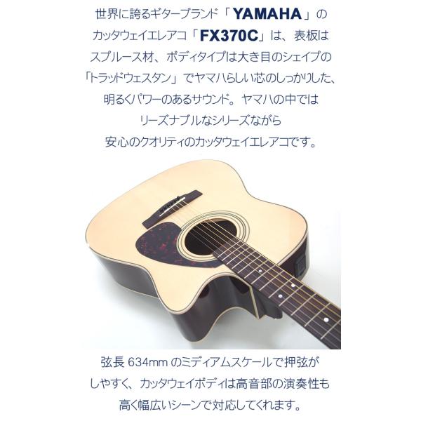 ■日本を代表するギターブランド「YAMAHA」の特別モデルながらヤマハの厳しい品質管理で安定した品質の『FX370C』。 どっしりとした、しっかりと鳴るウェスタン/ドレッドノートタイプのボディに、やや短めの弦長(634mm)で押さえ易さと音量を保持した特別な仕様。また、カッタウェイで演奏性も高くプリアンプも搭載、幅広いサウンドメイクと合わせてステージ上でも即戦力となります。