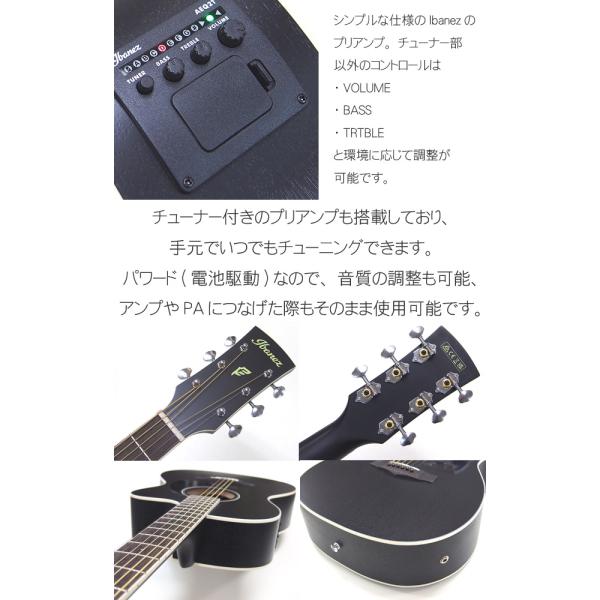 ■Ibanezブランドの中で、リーズナブルかつコストパフォーマンスの高い「PERFORMANCE」シリーズのブラックビューティーな『PC14MHCE』。表板はオクメでマホガニーに近い音質で中低音が豊かでふくよかなサウンド。弦長は634mmのミディアムスケールと薄めのネックで押弦しやすく、ボディシェイプは音量を確保しつつ抱えやすいサイズ感で、初心者の方や女性の方にも優しい1本です。また、チューナー付きのプリアンプ搭載しており、そのままアンプなどに繋いで出力が可能です。