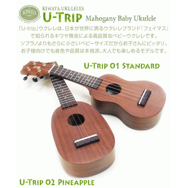 「U-trip(ユートリップ)」ウクレレは、日本が世界に誇るウクレレブランド『フェイマス』で知られるキワヤ商会による高品質なベビーウクレレです。ソプラノよりもさらに小さいベビーサイズだからお子さんにピッタリ。ひょうたん型のスタンダードタイプと、かわいいパイナップルの2タイプが揃っています。お子様向けモデルといっても、音色や品質はKSU-1譲りの本格派。大人でも楽しめるモデルです。